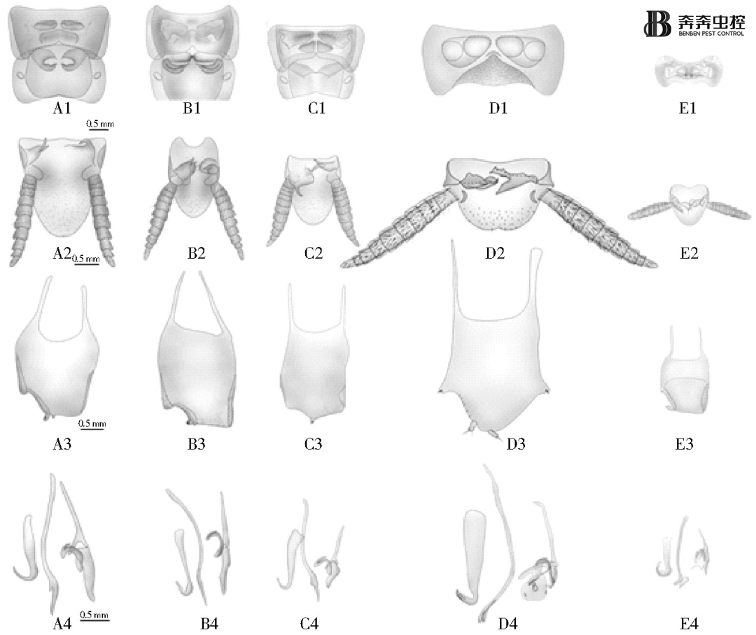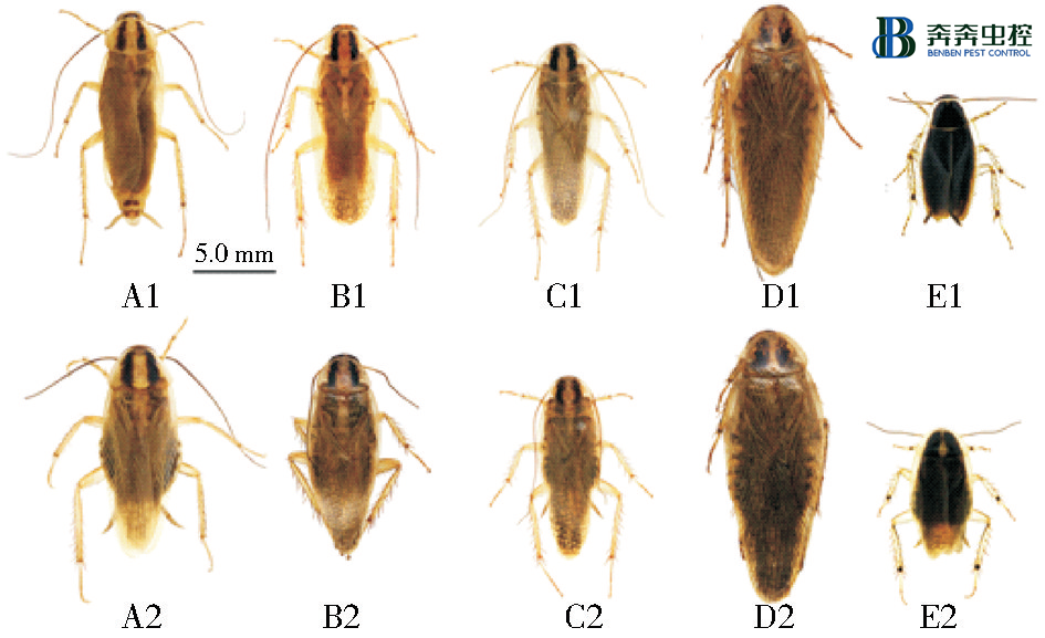 A. 德国小蠊;B. 拟德国小蠊;C. 双纹小蠊;D. 毛背小蠊;E. 单尾小蠊。