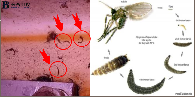 蛾蠓偏好在潮湿的凝胶状污垢层表面产卵(30-100 枚/次),常见的孳生地包括排水管内壁、排水口滤网、垃圾桶内壁、盆栽托盘等位置的污垢层。幼虫取食污垢层中的藻类、细菌、真菌等。在 21℃,卵期 32-48小时,幼虫期 8-24天,蛹期 20-40小时。