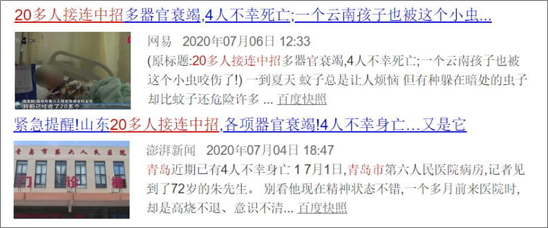 如有你有关注新闻,你应该知道,最近因为这个小虫子中招的人的不少,他们大多是在去野外游玩的时候中招,青岛电视台、各资讯网站还报道了4人因此而死亡。