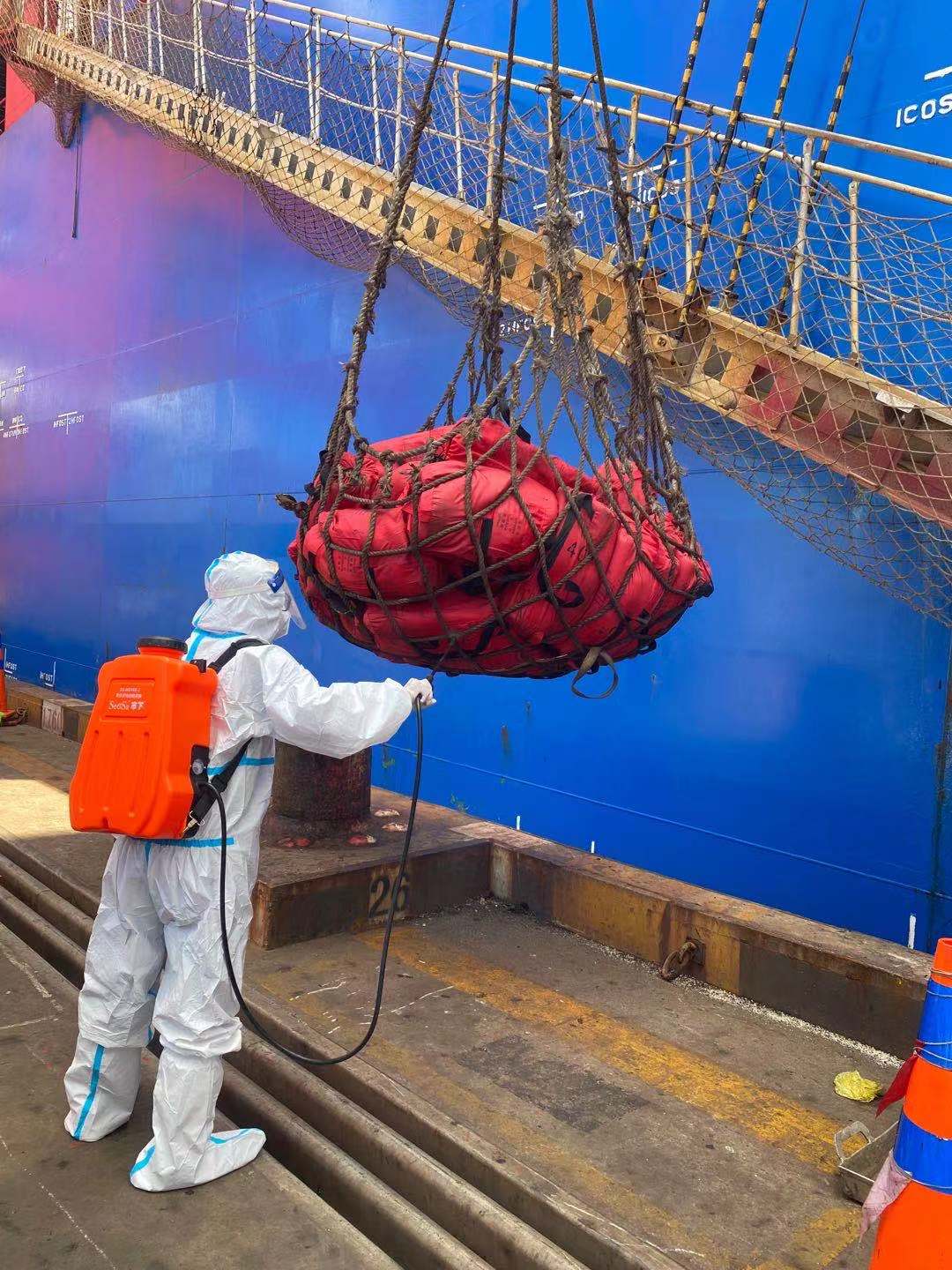 洋山深水港码头一万八千箱装特大号货轮救生设备回检消毒施工